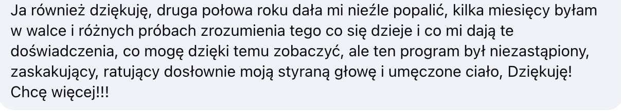 Z największą radością i ekscytacją poleciłam ten program moim przyjaciółkom. Jedna, natychmiast się zapisała i cały kurs mówiła jak bardzo uratował jej życie... Bo straciła kontakt ze sobą samą, a dzięki Tobie I kursowi znowu się odnalazła. Była bardzo szczęśliwa. I widziałam jak dosłownie przestała cierpieć. Oto siła tego programu. Twoja siła i moc!
