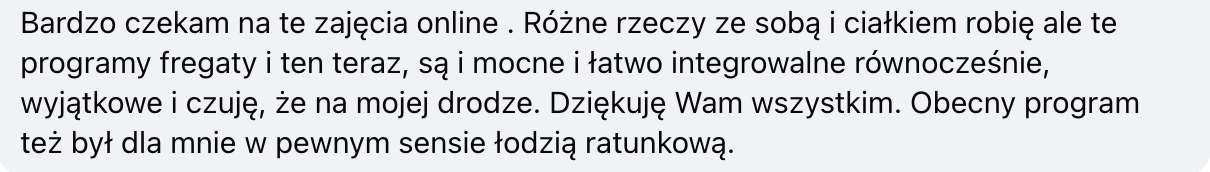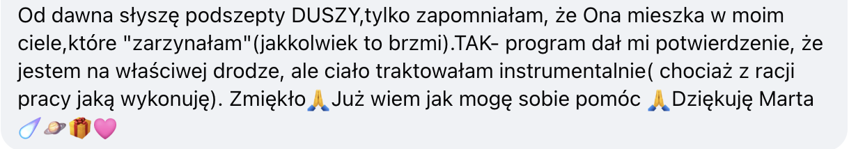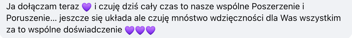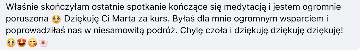 Program "Koniec i początek" był dla mnie doskonałą okazją i motywacją do tego, aby się zatrzymać i przyjrzeć miejscu, w którym jestem. Przyjrzeć bez oceny, a z ciekawością. Szczególnie cenny był w nim ruch, taniec w połączeniu z ćwiczeniami, które rozpisywałam sobie w zeszycie. Cały program był tak przygotowany, że wszystko tworzyło piękną całość. Mi ten program pomógł z wdzięcznością zajrzeć do przeszłości, odczuć swoją moc tu i teraz i popatrzeć z większą otwartości i energią w przyszłość. Mam poczucie, że zyskałam większą chęć do słuchania swojego ciała, bo zobaczyłam ile cennych podpowiedzi może mi dawać każdego dnia. Podczas tego programu czułam też energię grupy, to, że idziemy tą drogą razem, mimo, że każdy po swojemu, z tym co dla niego ważne. Marta miała uważność na nasze pytania, na to czym się dzielimy i też dawała różne wskazówki - to było piękne.