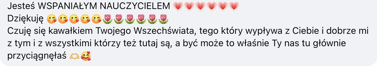 Dlaczego - bo z Twoich kursow tak strasznie duuuużo się dostaje. Czerpie się garściami, a wiele wglądów/tematów/praktyk/treści toczy się w człowieku długi dalszy czas, lata. Co to zatem muszą być za wartości że zostają na życie. Jak pięknie to jest podane ze się chce z tym być. To jest Twój wielki urok ( serduszko serduszko i jeszcze jedno)
